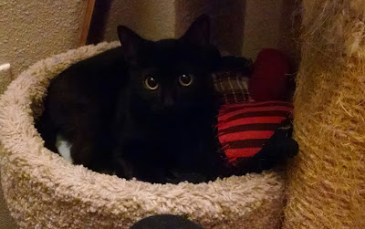 In the last few days, things have started to change. She ventures out around the house. She's learning how to lounge about on the furniture and steal the warm spot on the sofa. Irene has discovered her great passion for squishy food and watching things on "Cat TV", also known as through the screen on the back porch. She's approached me for a sniff and does not run from me when I go about the business of filling food bowls. She still has zero interest in having my hands on her, but she'll sit companionably beside me and Quatermain to eat her plate full of cod in cheesy bacon sauce.